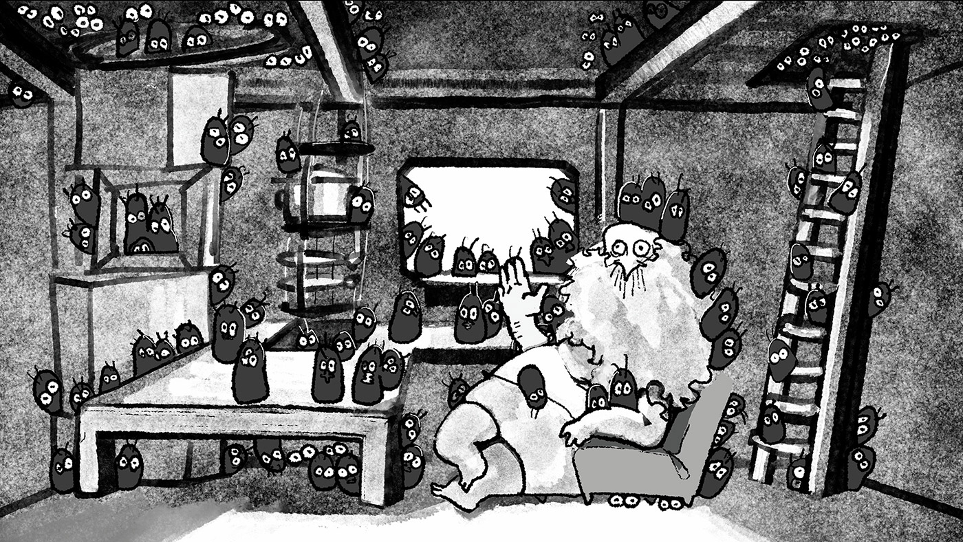There is a boy who lives with his grandfather on a small island. One day, the grandfather invites a large colony of mice to their house to live together. Unable to adapt to the new life with mice, a boy plans to escape by building a tall tower using driftwood and debris on the island.