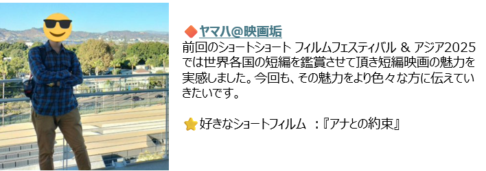 SSFF & ASIA 2025 秋の国際短編映画祭では、常日頃よりSNSで映画情報を発信している、映画愛あふれるレビュワー総勢30名の方々に、秋の国際短編映画祭SNSアンバサダーに就任いただきました。事前試写を行い、おすすめ作品を紹介いただくほか、アンバサダーが審査したBEST3ショートフィルムをオンライングランドシアターで10月22日より特別配信いたします。