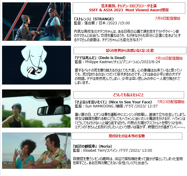 株式会社ビジュアルボイス(渋谷区:代表取締役 別所哲也)が運営するショートフィルム専門のオンラインシアター「ブリリア ショートショートシアター オンライン(以下、BSSTO)」では、7月3日は「涙の日」、7月9日は「泣く日」と、涙に関する記念日がある7月に、様々な涙が印象的に登場し、その「涙の訳」に物語が広がる作品を5週に渡り連続でお届けします。