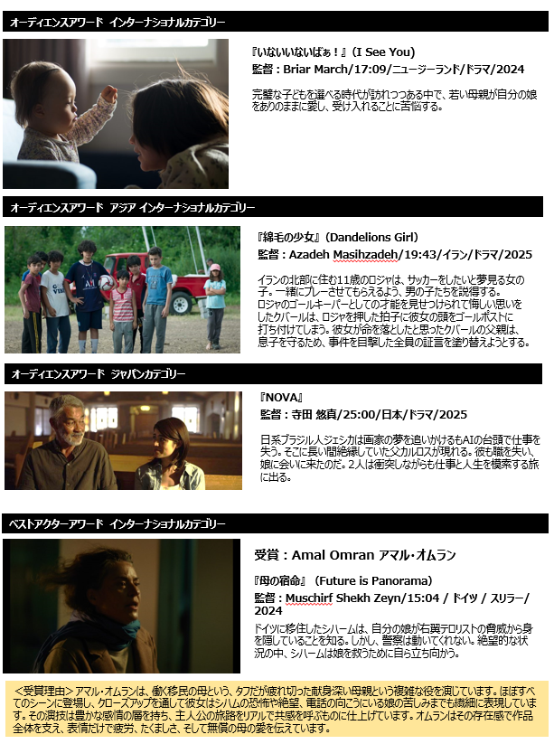 6月30日に閉幕した、米国アカデミー賞公認・アジア最大級の国際短編映画祭ショート ショート フィルムフェスティバル & アジア(SSFF & ASIA)2025 は、ライブアクション部門のインターナショナル、アジア インターナショナル、ジャパンの各カテゴリーのノミネート作品の中から観客の投票によって選ばれる「オーディエンスアワード」、最も心を掴む演技を評価するベストアクターアワード、そして、