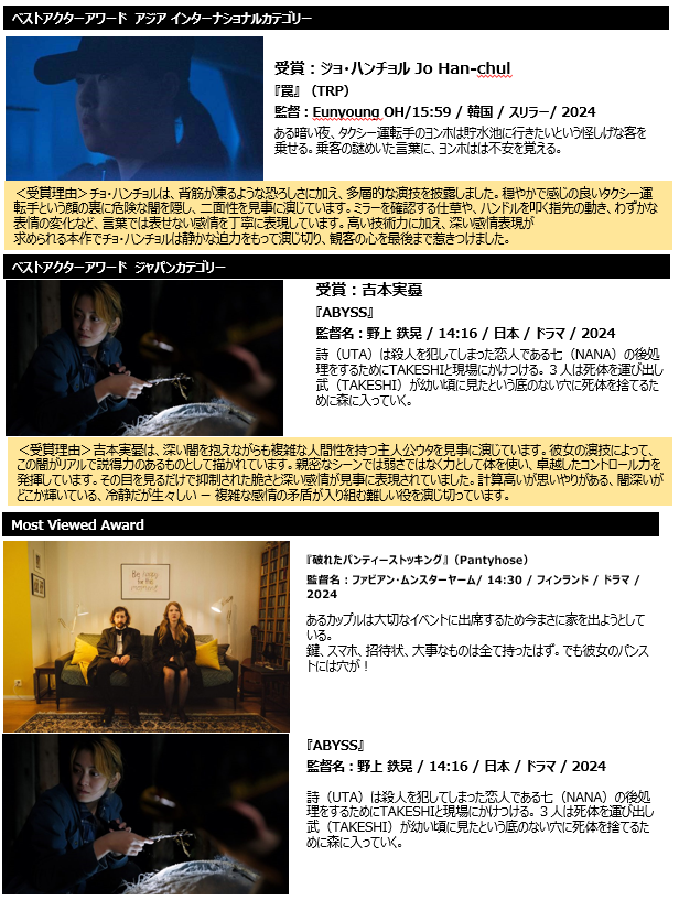 ベストアクターアワードには、インターナショナルカテゴリーより『母の宿命 / Future is Panorama』(ドイツ)主演のアマル・オムランさん、アジアカテゴリーより『罠 / TRAP』(韓国)主演のジョ・ハンチョルさん、ジャパンカテゴリーより『ABYSS』主演の吉本実憂さんが選ばれました。